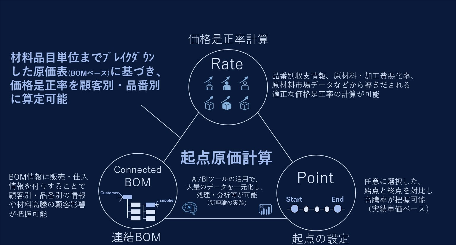 コスト構造、原材料市場データ、顧客情報に基づき価格是正率を算定し、客観的かつ説明可能な価格是正ロジックを構築。